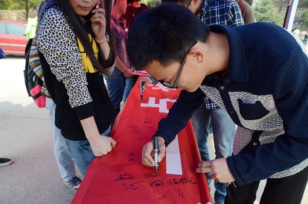 3月18日,伟德官网于美食广场前开展了戒烟签名活动,活动由校风督察部与青年志愿团联合承办。一幅巨大的戒烟标语刚铺在摆点处,就吸引了众多同学自发前来签名,其中不乏很多女生。一位女生和她的男友在横幅上签下了俩人的名字,她说,她多次劝告男友戒烟都没有效果,这次赶上学院戒烟活动她是铁了心要让男友成功戒烟。当天,共有800余名同学在戒烟横幅上签名。